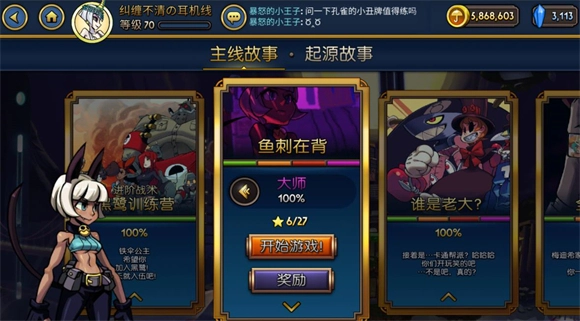 1、故事模式:故事模式整体分为主线故事与起源故事两部分,可通过界面上方进行切换。主线故事围绕骷髅之心展开的战斗,讲述各角色之间的关联与冲突;除首个教学关卡外,其余章节均设有基础、高级、专家、大师四个难度等级。点击“奖励”按钮可查看通关后的对应奖励,关卡下方的星星属于成就系统,需达成特定苛刻条件通关才能解锁成就并领取奖励,新手阶段不建议尝试挑战。起源故事则聚焦于每个角色的背景经历,通常要求对应角色出战,同样包含四个难度(当前仅孔雀角色开放了第四个难度);起源故事的经验奖励在初次通关后仍可重复获取,因此后续可作为稳定的经验获取关卡使用(开启双倍经验后挑战大师难度孔雀的最后一关,能获得极高的经验值)。