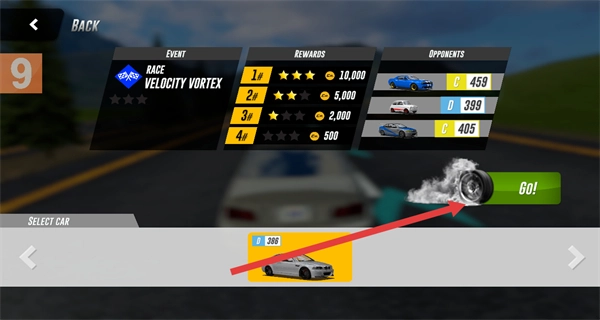 4、在比赛准备界面确认好车辆后,点击GO!按钮,就能正式开启赛车比赛。