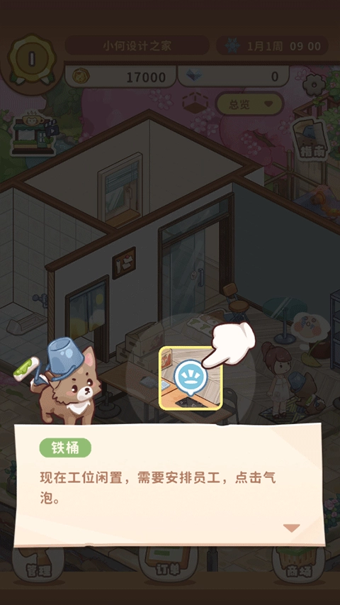 界面左上方有个让宠物犬外出获取收益的功能,每小时能得到两千多的报酬,中途休息五分钟后就能再次派遣它出发。还有通过移动设备接收业务需求的方式,需要为这些需求分配对应的设计人员来承接,这是获取收益的核心途径。游戏内的业务需求每天都会更新,不过不需要手动去布置家居陈设,只要设计人员承接任务后等待完成时间,到点领取对应的奖励就可以了。
