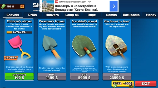 你能够靠售卖自己挖掘到的物品来获取更多收入,也可以使用金币对挖掘设备进行升级。