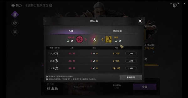 势力战于每日上午9点开启,时长10分钟。赛事在多个频道开展,每个频道最多可容纳190人。玩家既能自主挑选频道进入,也能在战斗过程中切换频道,不过切换后要等待较长的冷却时间。刚开始参与时,建议选择己方人数占优的频道,这样能提升获胜的可能性。势力战结束后,系统会依据势力的分数排名和对战结果发放奖励,就算没能获胜,也可以得到一定的BUFF加成与积分奖励。