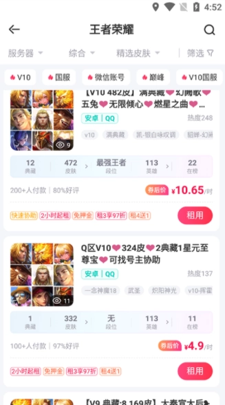 比如进入“王者荣耀”的账号页面,依据服务器、皮肤等条件对账号展开筛选。