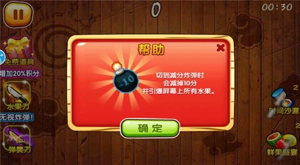 4.要是切到炸弹,会被扣掉10分,不过同时也会把屏幕里所有的水果都引爆。