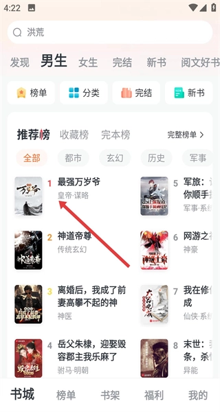 进入书城后,可选择男生、女生、完结等不同频道的推荐榜单,找到心仪书籍后点击书名即可进入阅读页面。