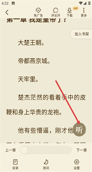 要是不想手动翻阅书籍,你可以在书籍阅读页面点击右侧的听书按钮,这样就能解放双手,开启听书模式,切换到音频播放的体验。