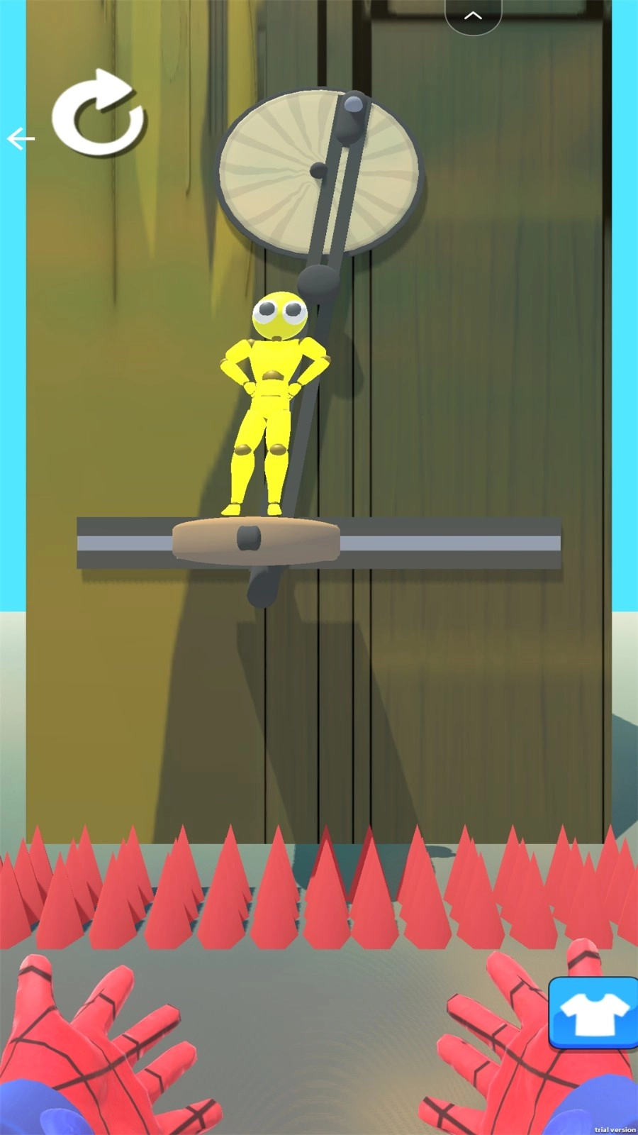 2.玩家的任务是消灭关卡里的黄色布娃娃机器人。点击屏幕吐出蛛丝,接着向下拉扯,借助尖刺将其消灭即可!