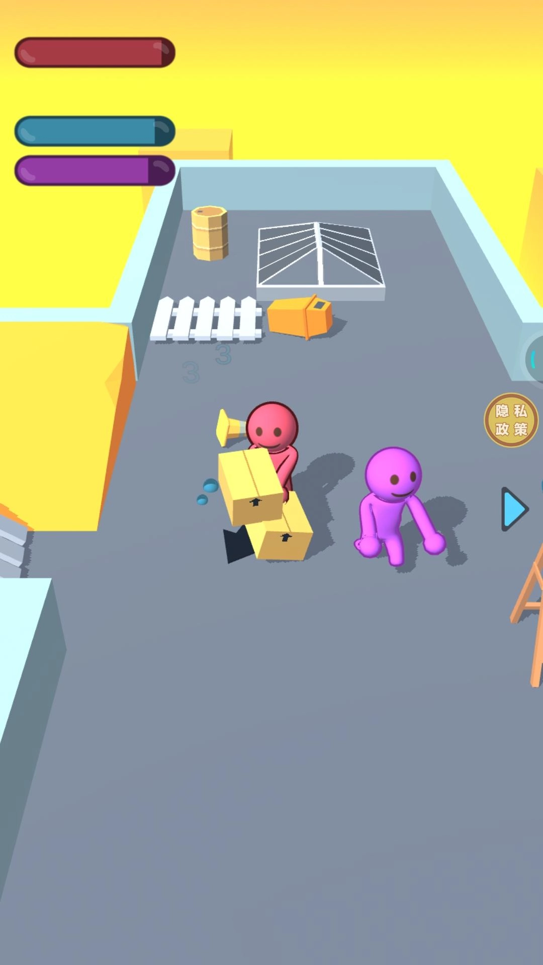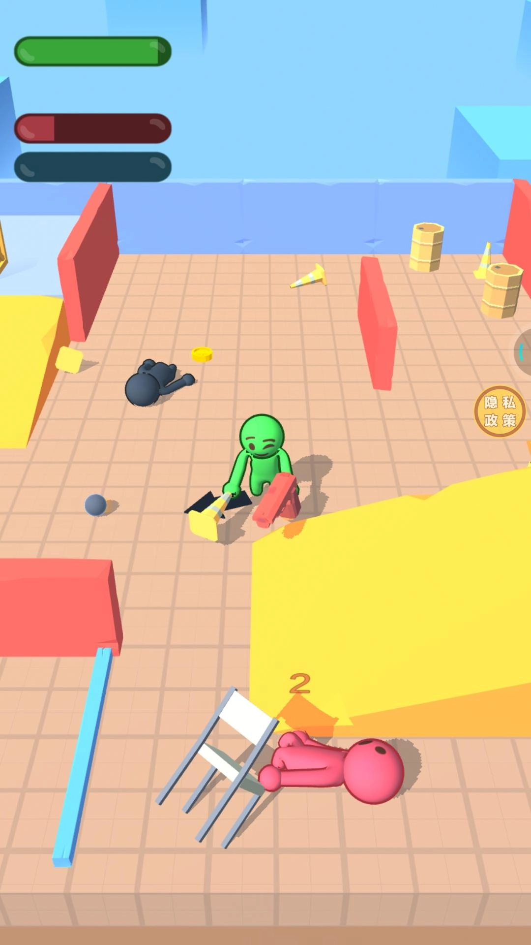 这是一款主打欢乐氛围的物理竞技游戏,玩家将操控造型诙谐的角色在竞技场中进行紧张刺激的对决。通过滑动屏幕实现角色的灵活移动,在场地中搜寻并拾取各类武器与道具,既可以用枪械发起射击,也能驾驶载具对敌人展开冲撞攻击,逐一击败其他对手,最终赢得比赛的胜利。