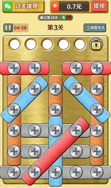 【闯关挑战】螺丝消消消的核心玩法是闯关挑战,玩家要完成关卡任务就得拧动螺丝、拆除铁板,这样就能获得红包奖励。