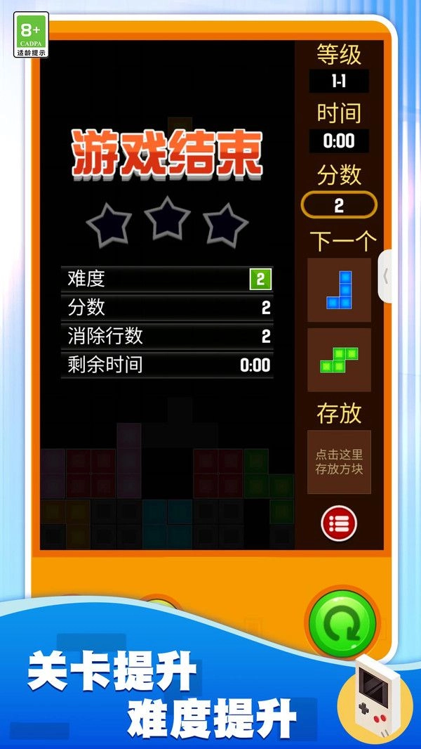 2、填满则游戏失败,三消方块不要求连续相同,相同的方块系统会默认配置到一起哒~
