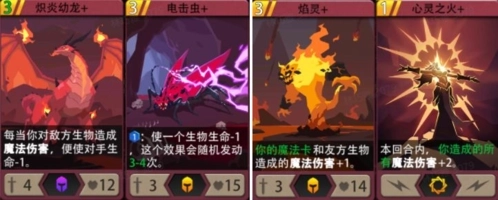 搭配焰灵、心灵之火这类能够提升法术伤害的卡牌,就能达成“清光所有怪物,击败敌方角色”的强大压制效果。