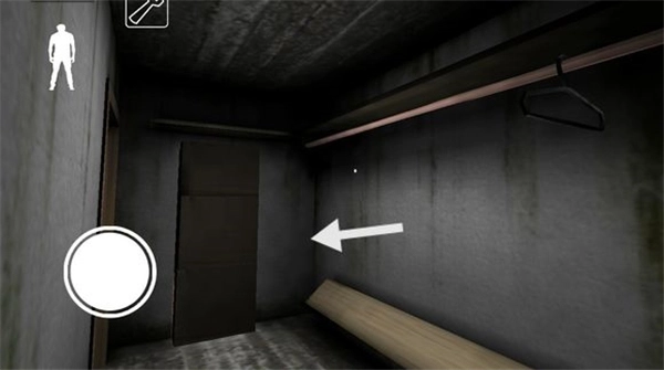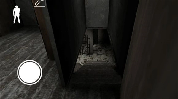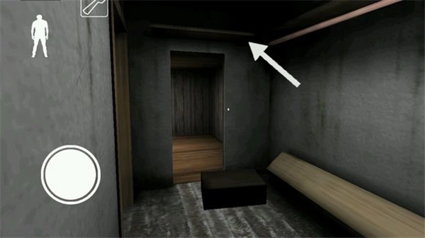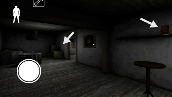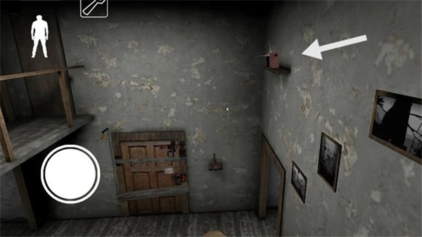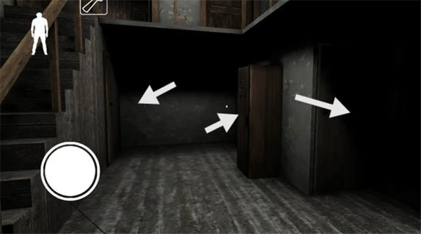 下楼梯后,左边地板上有一根黑线,从上面走过会触发铃铛响声,需要留意。楼梯旁边的柜子可以用来躲藏,柜子对面有一扇门,门内可能会有物品刷新。柜子旁边还有一扇通往地下室的门(因画面光线较暗)