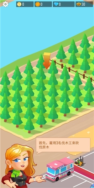 首先在游戏的首张地图里,玩家得先砍伐树木,接着用剥树皮的机器给树木去皮得到原木,再用金币建一个木板制造厂,把原木放进厂里加工成木板,之后把木板搬到货车上运去卖掉,以此获取金币。