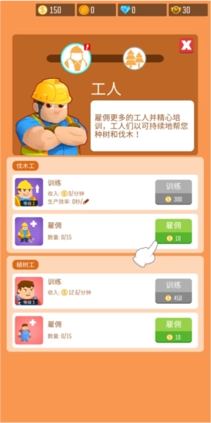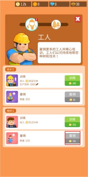 2、您可以雇佣更多工人并对他们进行精心培训,这些工人将能持续为您种植树木和采集原木。在这里,玩家能看到伐木工和植树工两种角色,而且雇佣这两种工人的费用有所不同,接下来我们先雇佣一名伐木工吧!