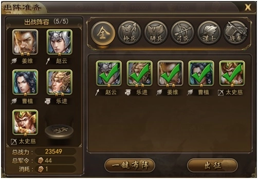 需要特别注意的是,要尽可能多地勾选不同兵种以及数量充足的武将,并且依据每个武将对应的兵种来合理排兵布阵。要是觉得手动布阵太麻烦,也可以直接使用【一键布阵】功能。这样一来,不仅能确保兵种的全面性,还能有效提升整体战力,让你在战场上能够灵活应对各种情况,势不可挡!