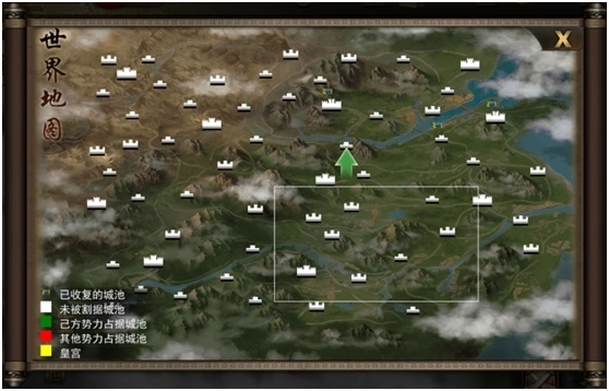 点击【小地图】,即可切换至世界地图界面。其中,旗帜标识的是已收复的城池;白色标记的是尚未被割据的城池;绿色代表由己方势力掌控的城池;红色对应其他势力占据的城池;而黄色则特指皇宫所在之处。