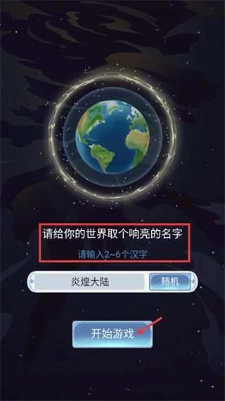 1、为世界拟定一个2-6个汉字的名称,例如【炎煌大陆】,之后点击【开始游戏】按钮,即可开启世界创建的旅程。