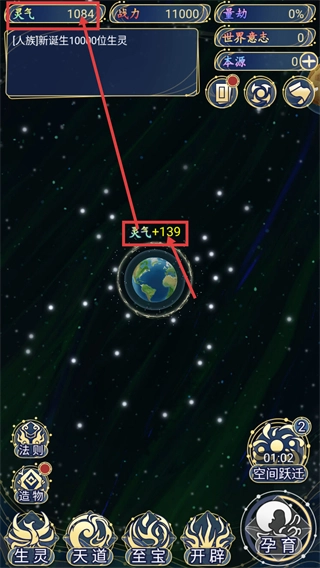 2、留意【灵气】数值的增长情况,借助积累【灵气+139】来提高世界基础资源,为后续的发展打下基础。