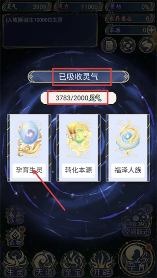 3、当【已吸收灵气-3783/2000】时,点击【孕育生灵】按钮,以推进世界生灵的繁衍进程。