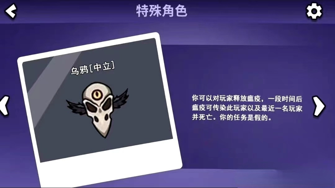 1、乌鸦是中立阵营的角色,技能是对附近的玩家释放瘟疫,中瘟疫的玩家10s后会将瘟疫传染给附近最近的一名玩家并且两人一起阵亡,你的任务是假的