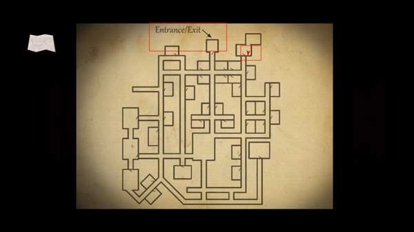 4、玩家能够打开地图查看自己的当前位置,红色箭头所指之处即为你现在所在的地方,标有EXIT字样的则是出口。