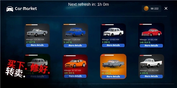 我的爱车2MyFavoriteCar2是一款超有沉浸感的汽车翻转模拟游戏,玩起来特别带劲。在这个游戏里,玩家可以尽情享受二手车买卖的乐趣。你能在逼真的汽车市场中挑选自己喜欢的二手车,和卖家讨价还价,努力用最划算的价格把车买下来。