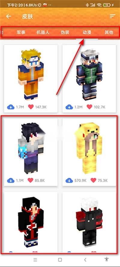根据个人喜好,从“动漫”“军事”等类别中挑选心仪的皮肤类型