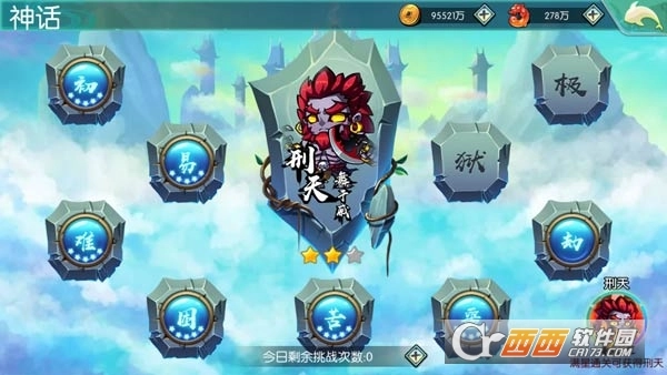 等级必须达到35级,即可开启神话玩法;神话系统一共分为三个副本:刑天舞干戚、逐鹿中原及万妖之王,每个副本一共九个小关卡,不同副本获得进入条件不同,获得材料也不同。