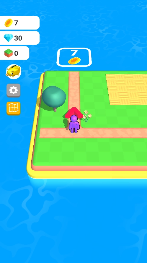 1、进入初始岛屿场景后,操控紫色角色沿着指定路径移动,收集界面上显示的金币等各类资源。