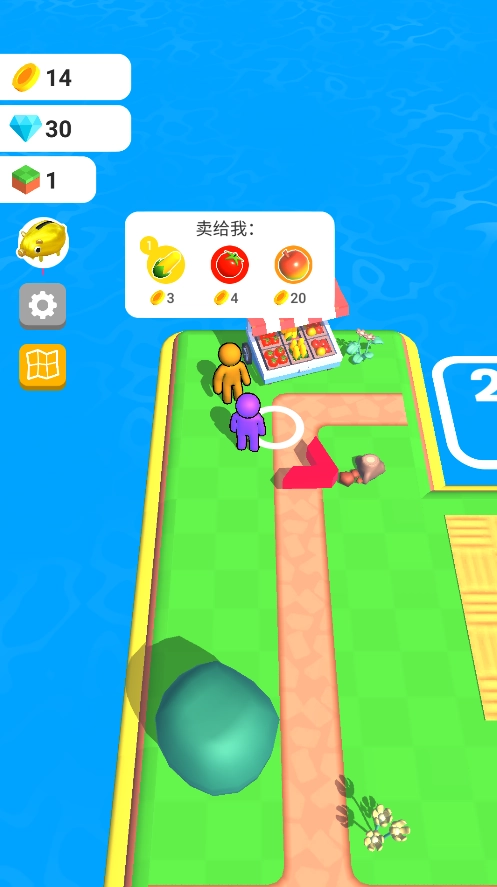 2、进入交易阶段后,紫色角色需与橙色NPC进行互动,按照提示售卖指定的蔬果以换取奖励。