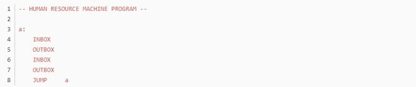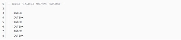 你的程序需要指示工人把INBOX里的每样物品都取出来,再放到OUTBOX中。