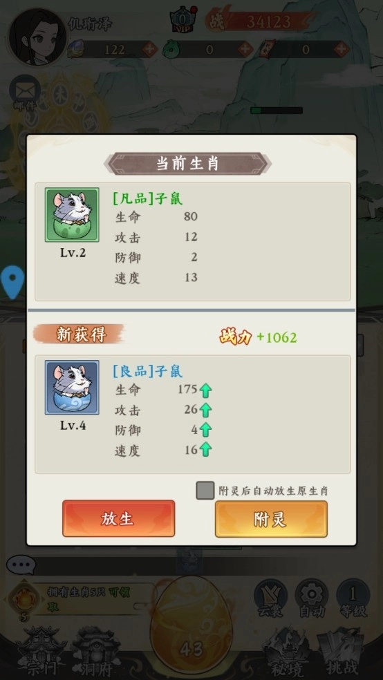 3、点击金蛋就能收集十二生肖来提升战力,游戏后续还会解锁坐骑、灵兽、神通等丰富多样的养成玩法。