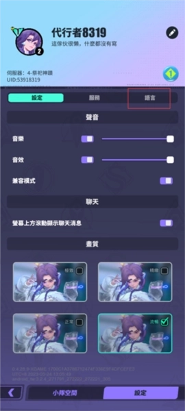 2、玩家可在这里更改游戏画质,然后点击语言;