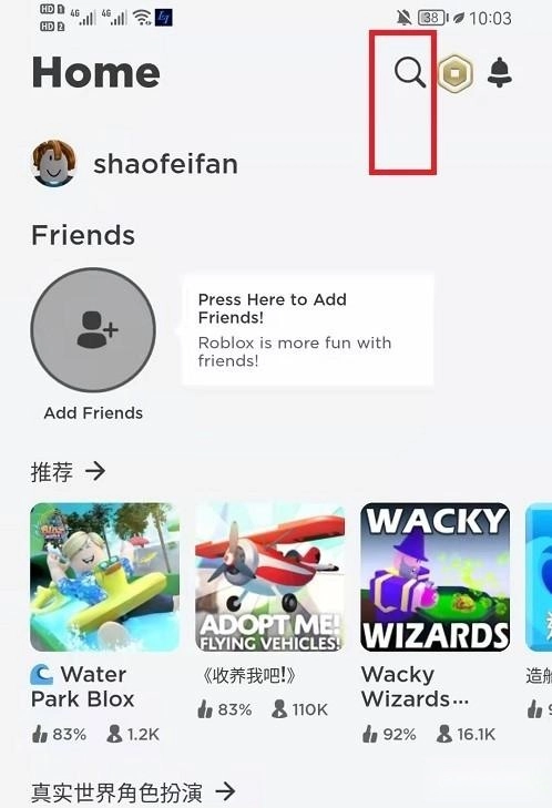 2、登陆游戏,登陆成功之后,首页界面的上方的【搜索】,然后进入到搜索界面中;