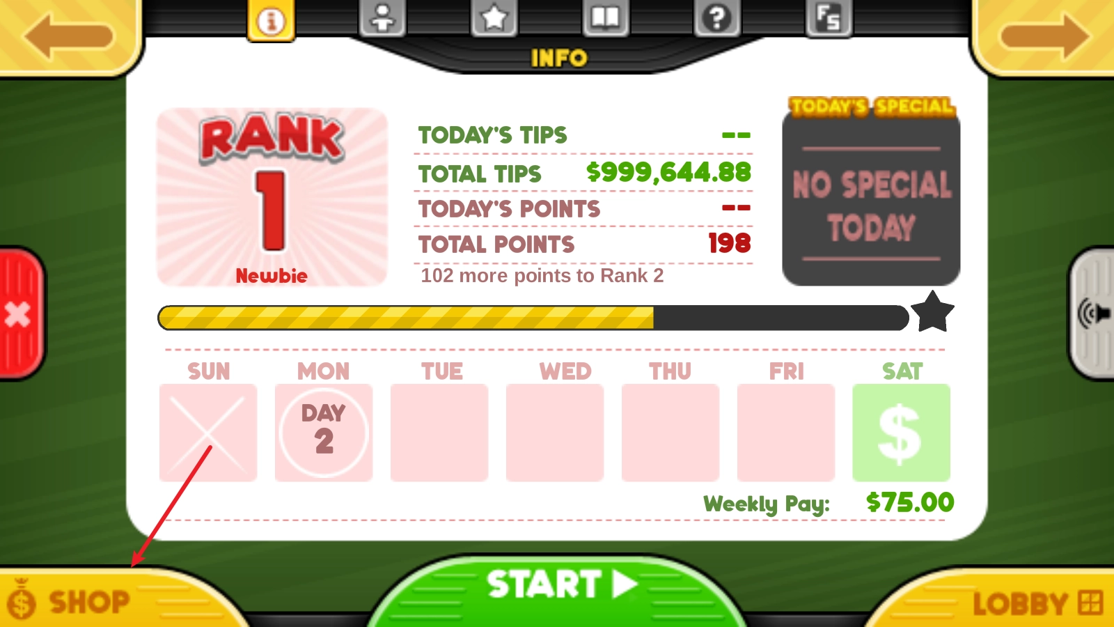 在每日营业结束后的结算页面,我们点击左下角的shop。