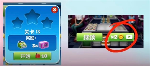 在《飞机大厨》里,通关是获取金币的主要途径,每次通关都会有金币奖励,首次通关或首次达成某星级评价还能拿到宝箱奖励,偶尔还会触发观看广告获得2倍金币的随机福利。游戏内广告入口十分丰富,点击物品旁的加号可进入对应物品的专属广告,日常广告则覆盖了除星星外的各类物品奖励,同时还有机会获得随机纪念品。