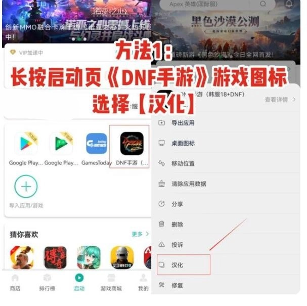 若自动汉化未能完成,您可以通过以下两种手动方式来实现汉化:一是长按启动页面上的《DNF韩服》游戏图标;二是在游戏界面的悬浮球中找到并选择“汉化”功能。