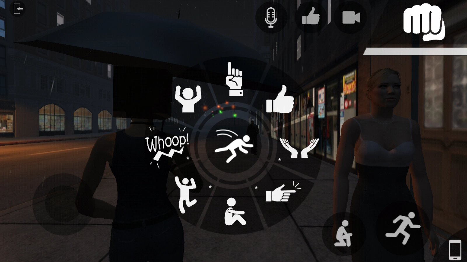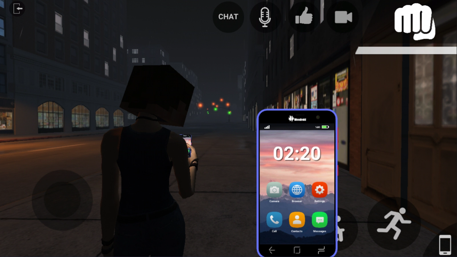 进入游戏后,你可以先点击【chat】对话框。左边的圆圈用于控制前进或后退,右边的则对应蹲下和跳跃操作。另外,还能点击右下角的【手机】图标,进行拍照或打电话。