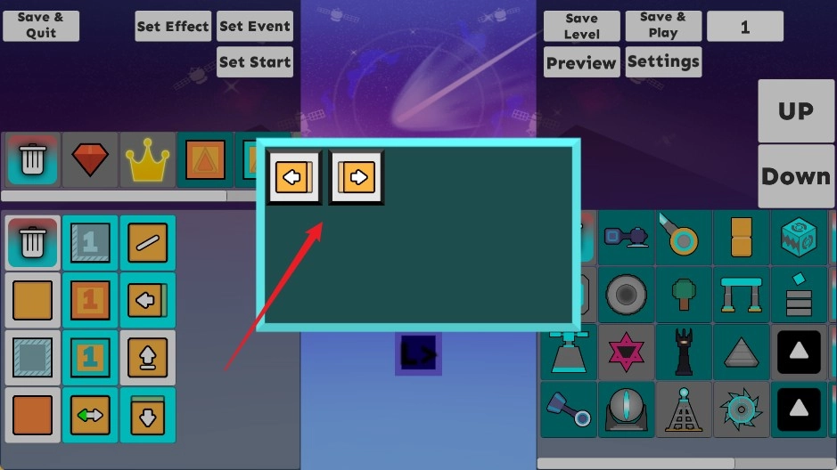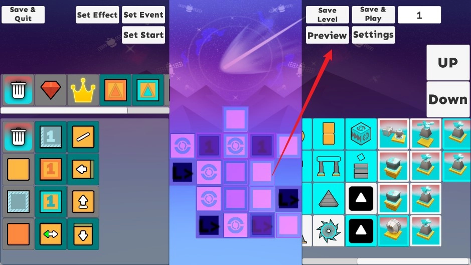 制作完成后,点击界面上的“箭头按钮”就能预览整段关卡的效果。
