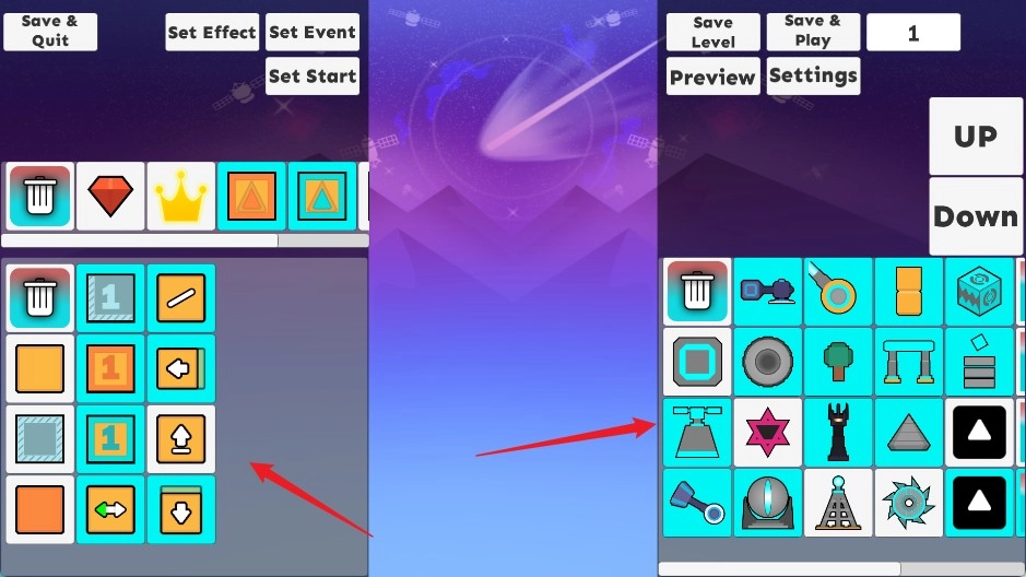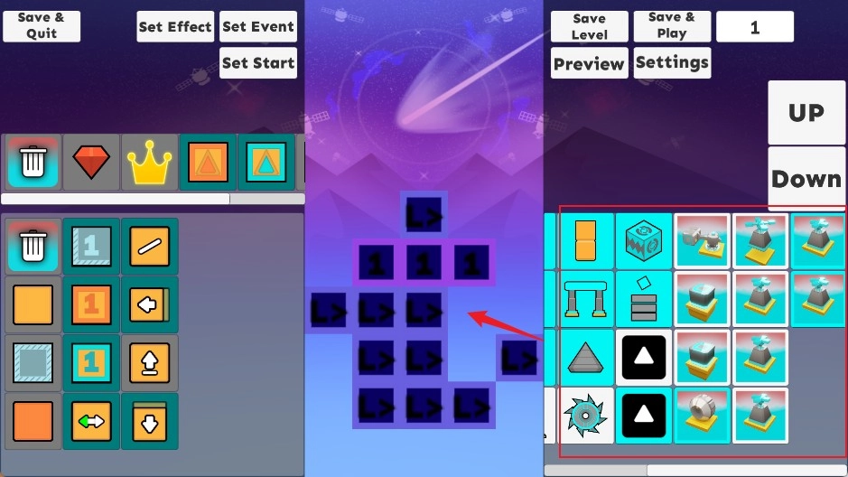 界面左侧陈列着各类地板与奖励元素,右侧则摆放着道具与机关,你可以依据自己的创意进行自由组合搭配。