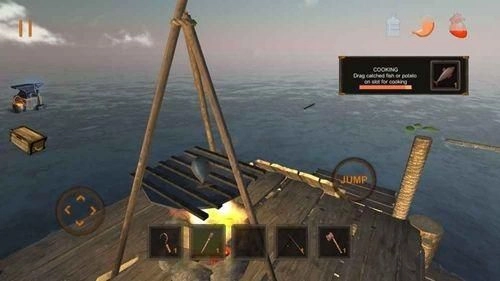 4、除此之外,你还得制作工具来蒸馏海水,让它变成可以喝的淡水;也可以用钓竿钓鱼,或者搭建小土盆种土豆来解决温饱问题。值得庆幸的是,这个游戏里的食物没有保质期限制,你完全可以放心地在一段时间内囤积大量食物,之后只要稍微留意鲨鱼攻击木筏,就能专心去做其他事情了,比如不断扩大木筏的面积,在上面建造出理想中的“三室一厅”之类的设施。
