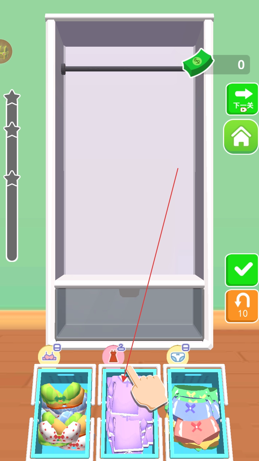 滑动屏幕将衣物拖入衣柜区域,分类收纳。