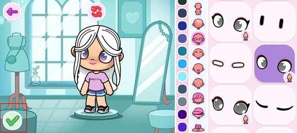 用户能够对角色的外观进行个性化设置,涵盖发型、眼镜、眉毛、鼻子、嘴巴等多个方面,完成设计后,点击界面左下角的对勾图标就能保存相关设置。