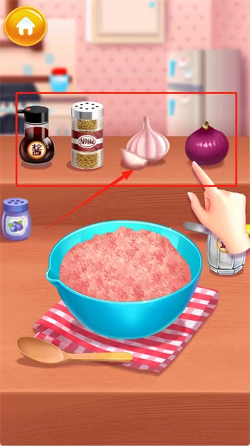 请根据红色方框与箭头的指引,选择大蒜或洋葱进行食材烹饪的启动操作。