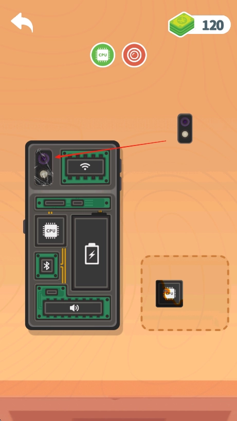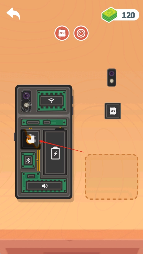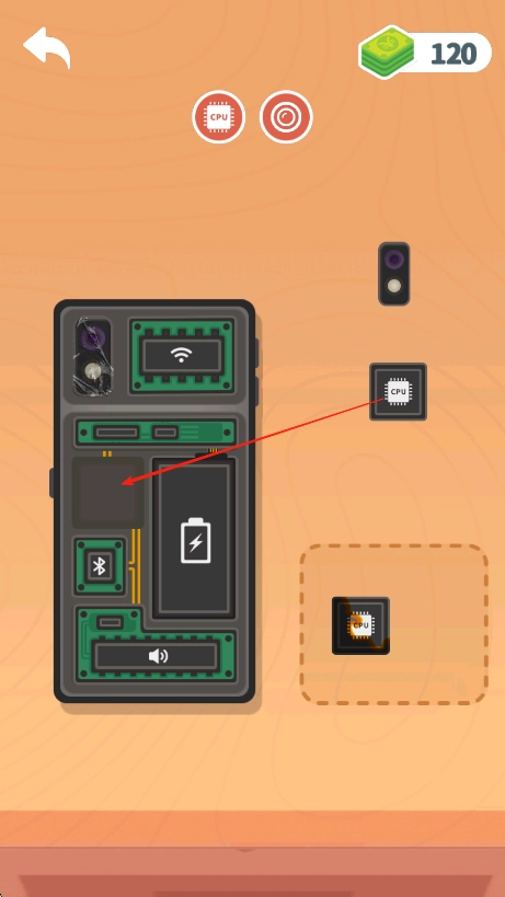 留意手机主板上的空缺区域,通过点击和拖拽操作,将像中央处理器这类对应的电子元件,精准安置到主板上匹配的位置。