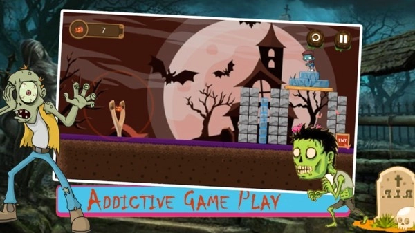玩家操控弹弓,通过拖拽动作积蓄弹力,对准画面中的僵尸,松开手指后发射弹丸攻击目标。