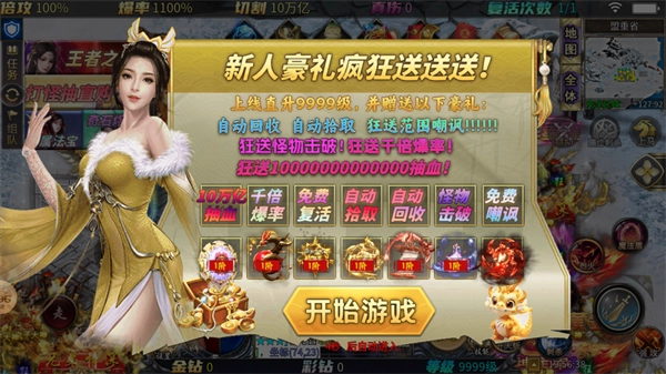 1、充值比例1:1,上线即领万亿切割、范围嘲讽技能,角色还能直升9999级!