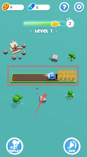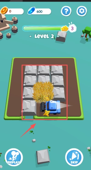 4、留意蓝车与草堆这一任务目标,也可通过点击左下角的“REPLAY”或右下角的“SKIP”来控制关卡进度。