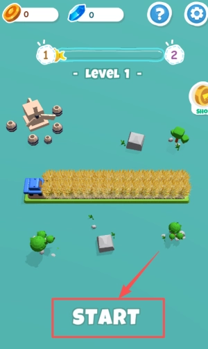 1、点击红色边框的白色START按钮,或者留意顶部的金币钻石图标以及Level 1进度条,以此开启第一关。