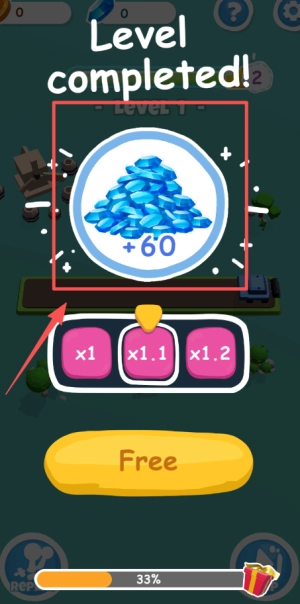 3、点击黄色的“Free”领取奖励,或者选择x1、x1.1、x1.2倍率按钮,查看“+60宝石”的获得提示。