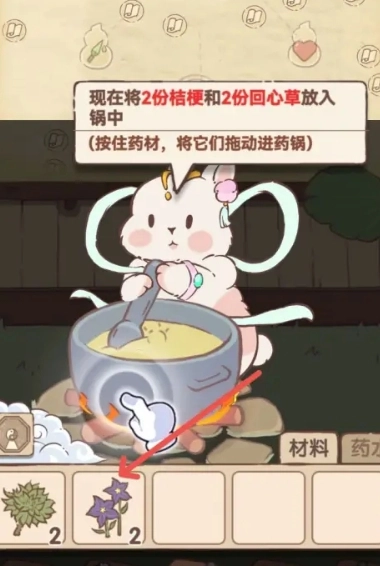 1、开启兔与药游戏的制药玩法,将制作治疗药水所需的药草放入药锅中。